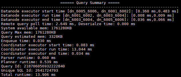 The total execution time and network traffic, including the maximum and minimum execution time in the initialization and end phases on each DN, initialization, execution, and time in the end phase on each CN, and the system available memory during the current statement execution, and statement estimation memory information.