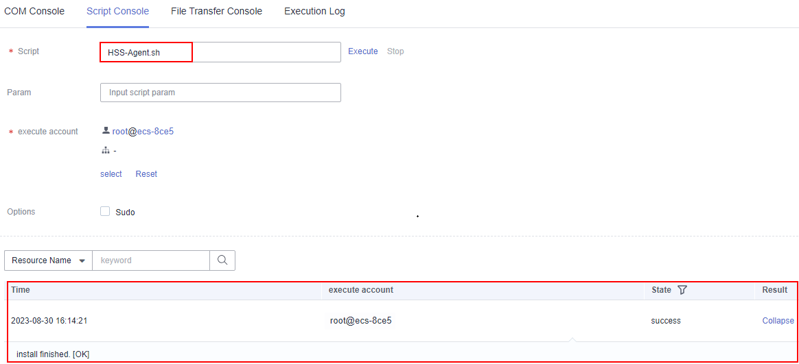 This parameter is optional. By default, the script task is executed in the Sudoers file on the server. If the server account does not have the execute permission on the file, select Sudo.