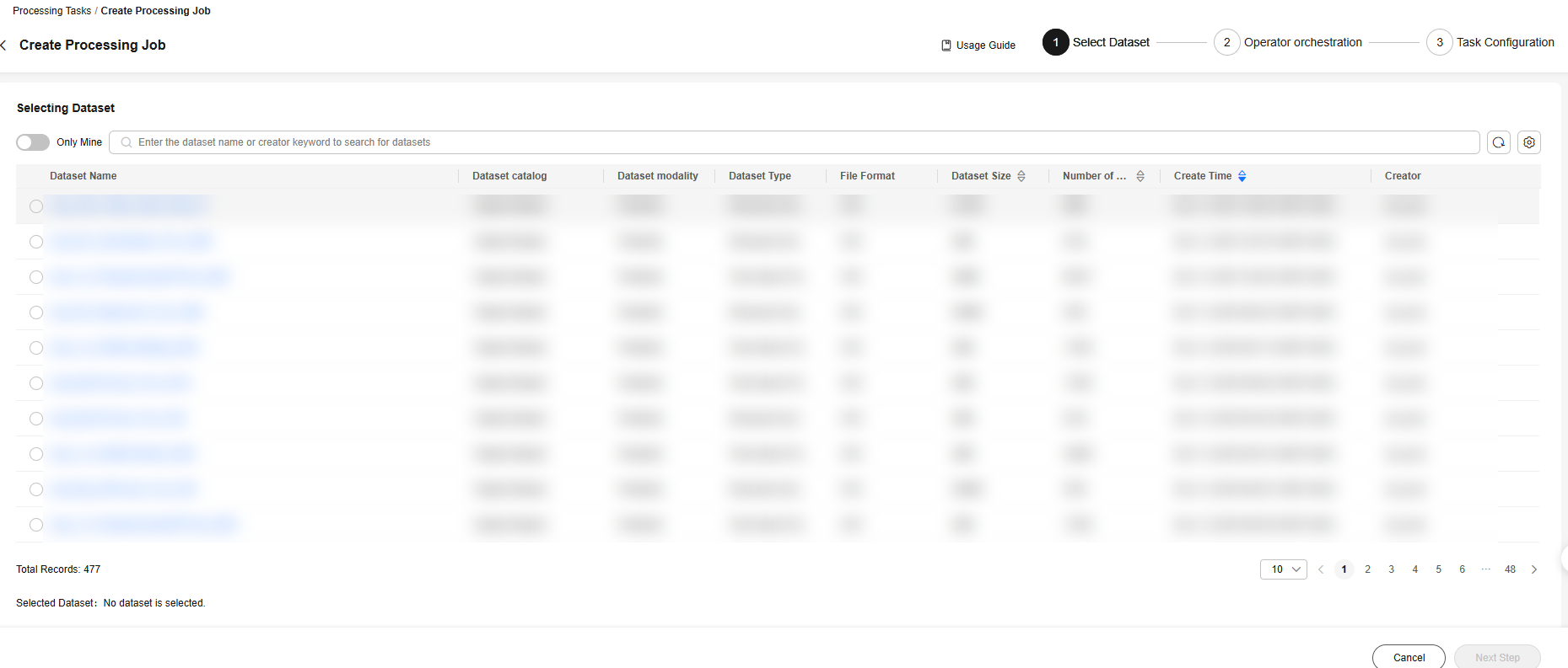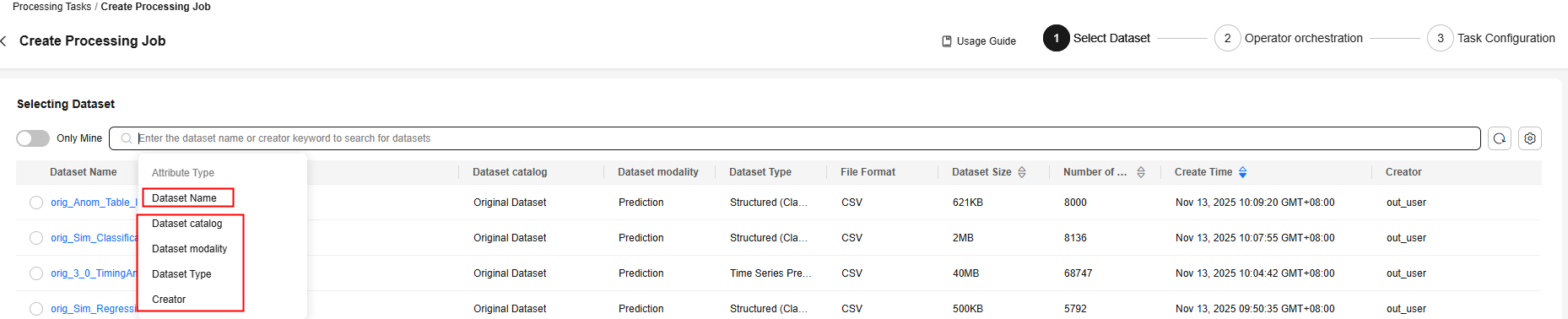 The platform supports dataset filtering when you create a data processing task. You can filter datasets by dataset name, dataset category, dataset modality, dataset type, or creator. The attribute type must be the same as the type of the created dataset.