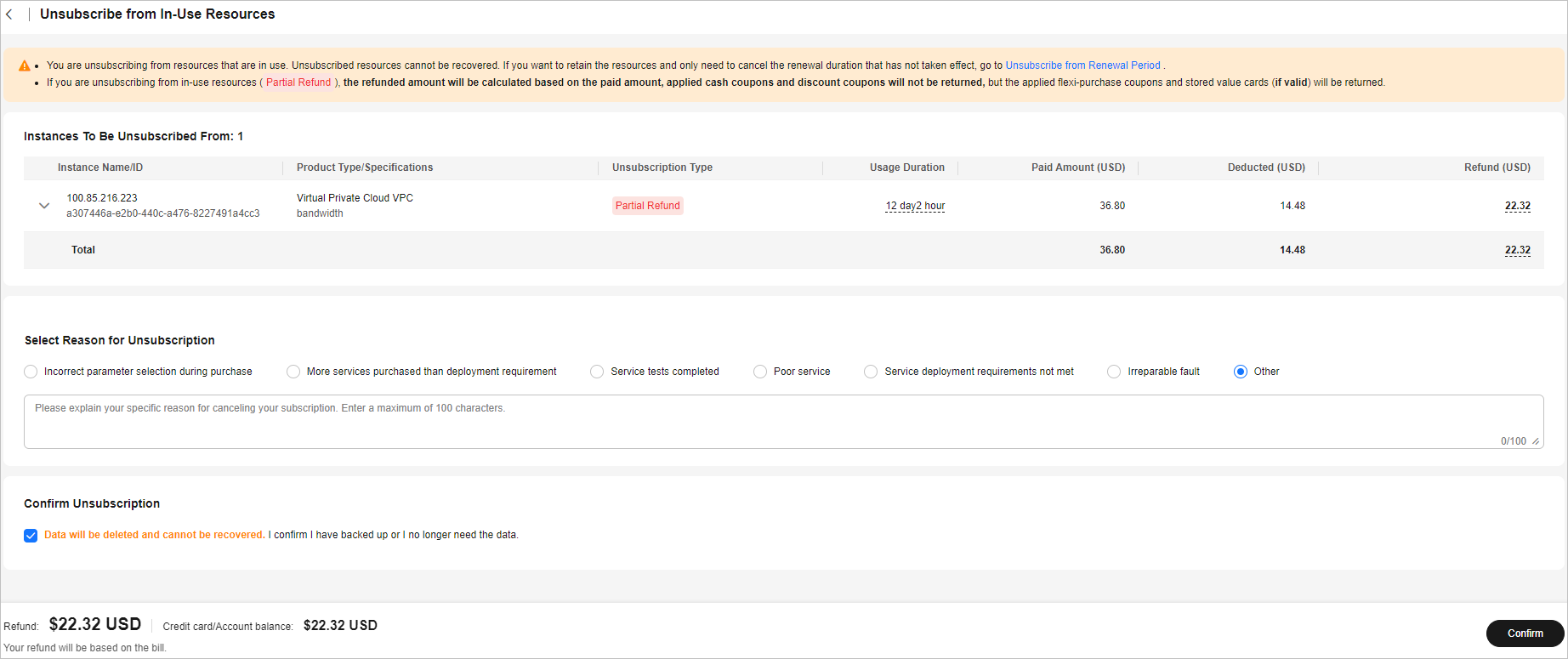 - View the unsubscription information and refunds. Select the unsubscription reasons, select the confirmation checkbox, and then click Confirm.