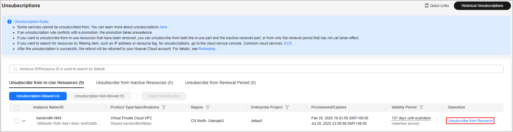 - Before unsubscription, ensure that data on the resources to be unsubscribed from has been backed up or migrated. After the unsubscription, the resources will be deleted, and the data on them cannot be restored. Exercise caution when performing this operation.