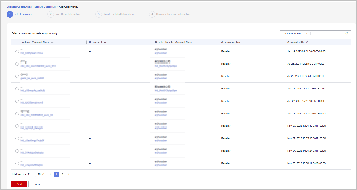 - Click Add Opportunity. On the displayed page, select a preregistered customer or an associated customer to create an opportunity. Click Next.