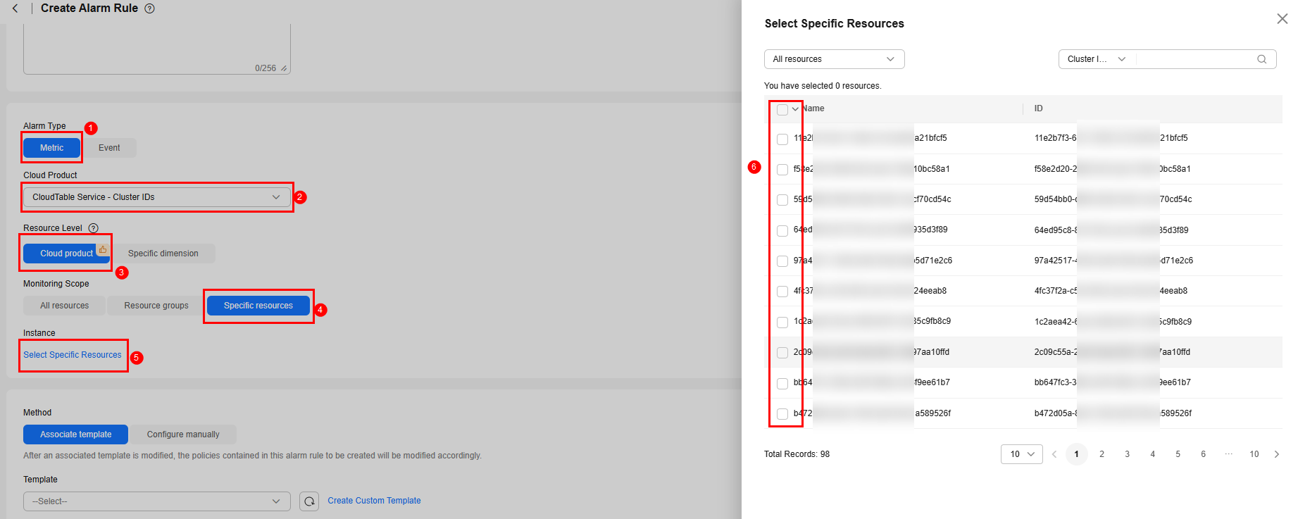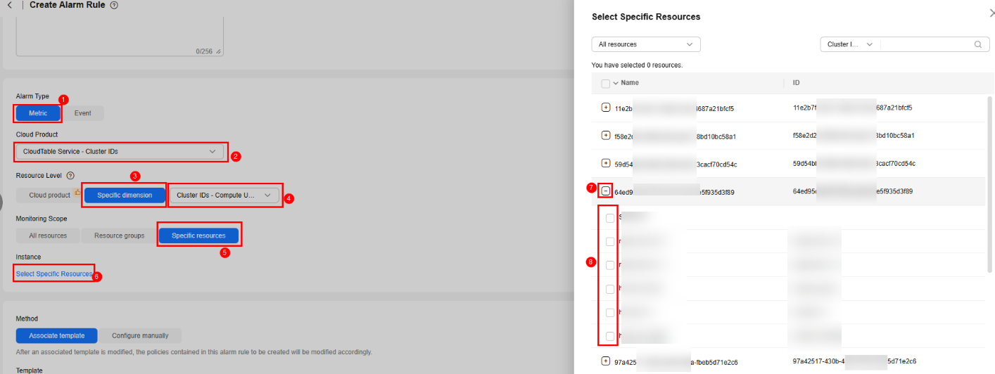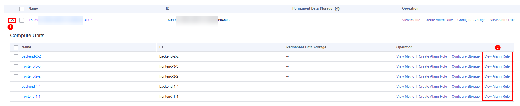 - Specific dimension > Cluster IDs - Compute Units: Alarm rules are specified by cluster node.