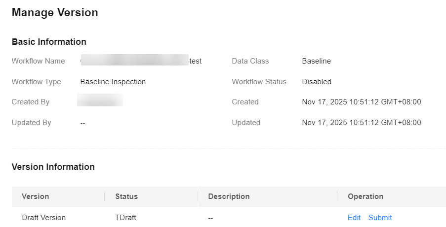 - On the Version Management slide-out panel for the workflow, find the Version Information area, locate the row containing the target workflow version, and click Edit in the Operation column.