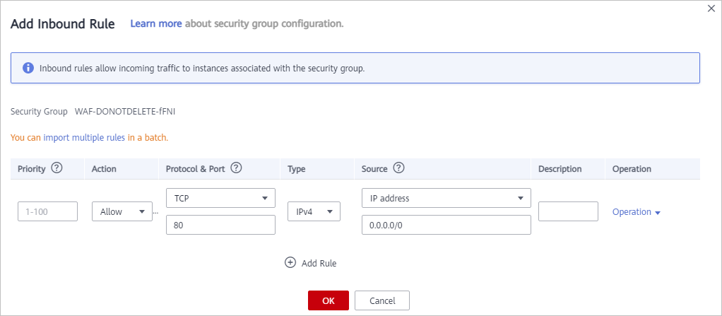 • If you also use Cloud Firewall (CFW) on Huawei Cloud, refer to Adding a Protection Rule.