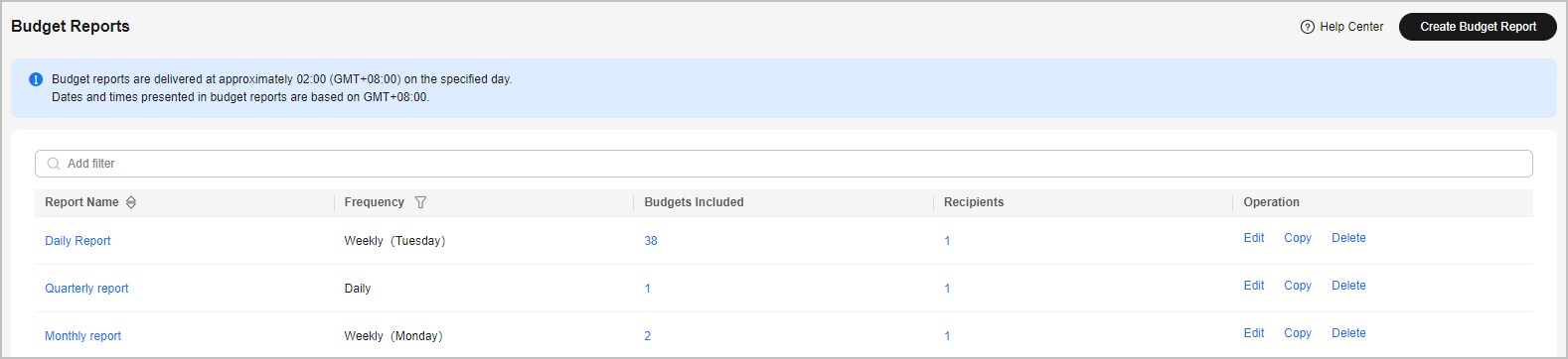 - You can create a daily, weekly, or monthly budget report to inform relevant personnel so that the costs are always visible to the relevant business departments, finance departments, and CTO of your enterprise. For details, see Using Reports to Track Your Budget.