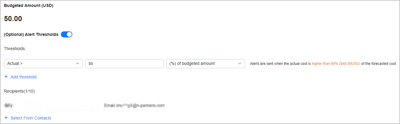 In addition to viewing the budget progress in Cost Center, you can also configure budget alerts. If the actual or predicted usage reaches the specified threshold, you will receive an alert via SMS or email so that you can take measures in a timely manner.