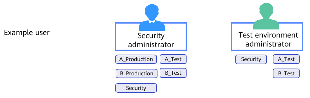 Enterprises can authorize member accounts by enterprise project in IAM to isolate the resources of different services. Take a security administrator and a test environment administrator as an example:
