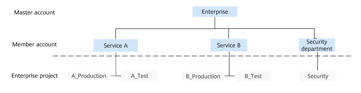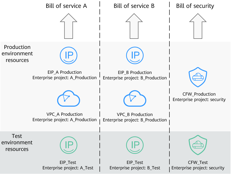- To manage services A and B separately, the enterprise creates enterprise projects A_Production and A_Test for service A, and B_Production and B_Test for service B. Cloud resources are bound to the corresponding enterprise projects based on service teams during purchase.