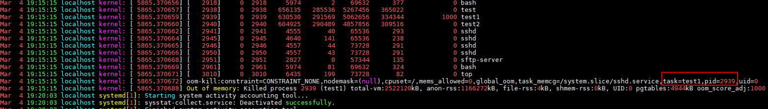 After a period of time, OOM occurs in the system, and OOM killer is triggered. At the same time, the memory information of all processes in the system is printed in /var/log/messages, and process test1 is terminated.