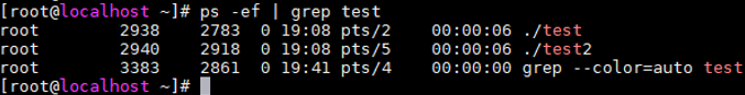 root        2938    2783  0 19:08 pts/2    00:00:00 ./test