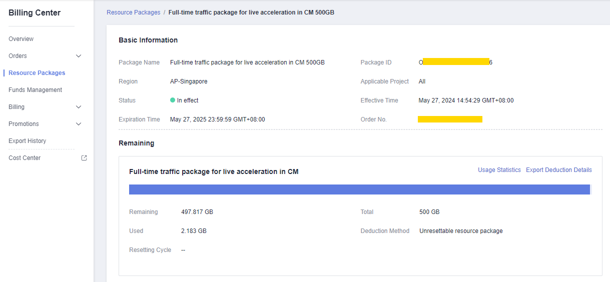 You can log in to Huawei Cloud Billing Center, choose Resource Packages, and click Package Name/ID of the desired resource package on the Resource Packages tab page to view the package details.