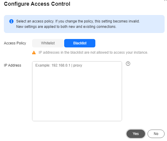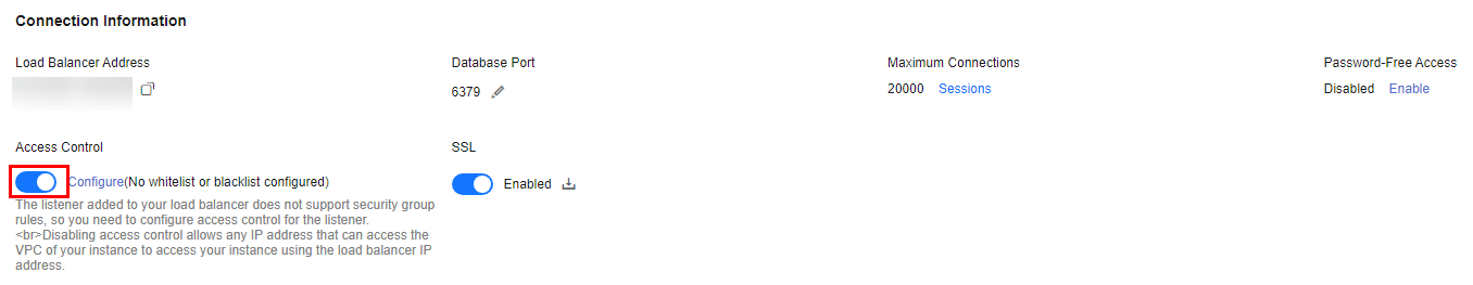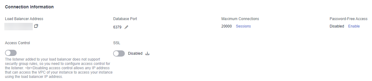 - A load balancer address does not support security groups. After instance creation is complete, configure IP address access control. If no whitelist is configured, all IP addresses that can communicate with the VPC can access the instance.