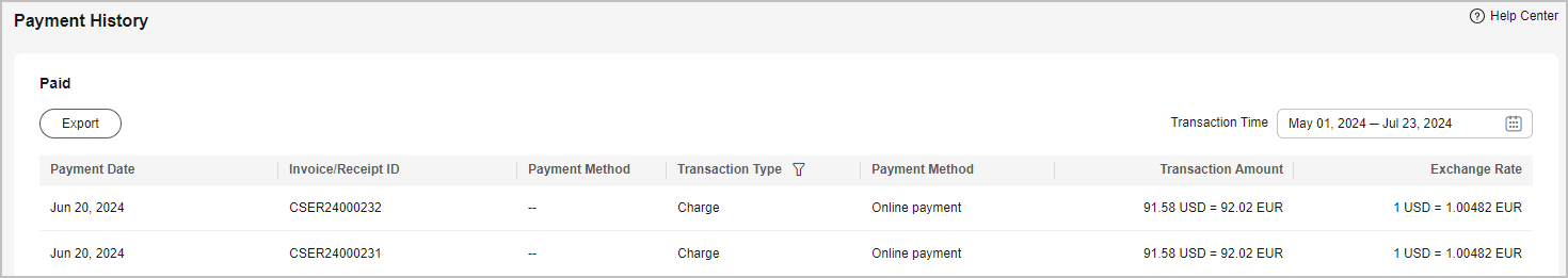 Click Export in the upper left corner of the page. You can download the exported contents on the Billing Center > Export History page.