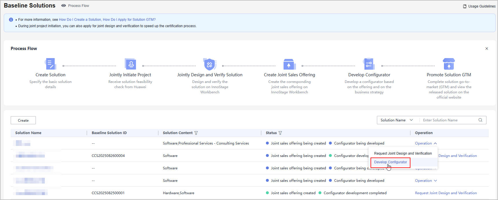 - On the Baseline Solutions page, select a solution in the Configurator being developed state and click Develop Configurator in the Operation column.