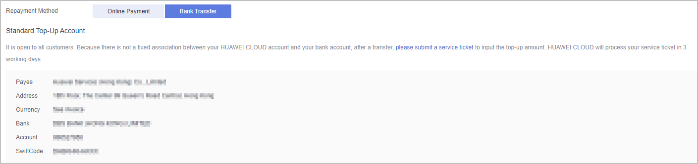 - Upload the bank transfer certificate and submit the service ticket. After the bank transfer is complete, Huawei Cloud will top up your account upon receipt of the request from the service ticket within three working days.