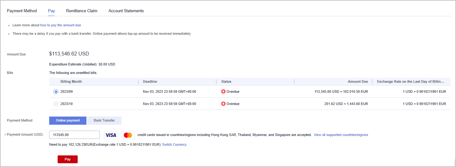 You can pay the bill before the due date, or Huawei Cloud will automatically deduct the amount from your account balance on the due date. If your account balance is insufficient, you can make online payments or transfer money to pay the bill.