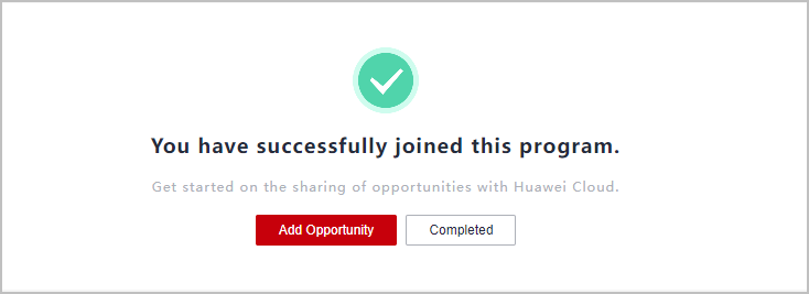 - A message is displayed indicating that you have successfully joined the program. Now, you can get started on the sharing of opportunities with Huawei Cloud.