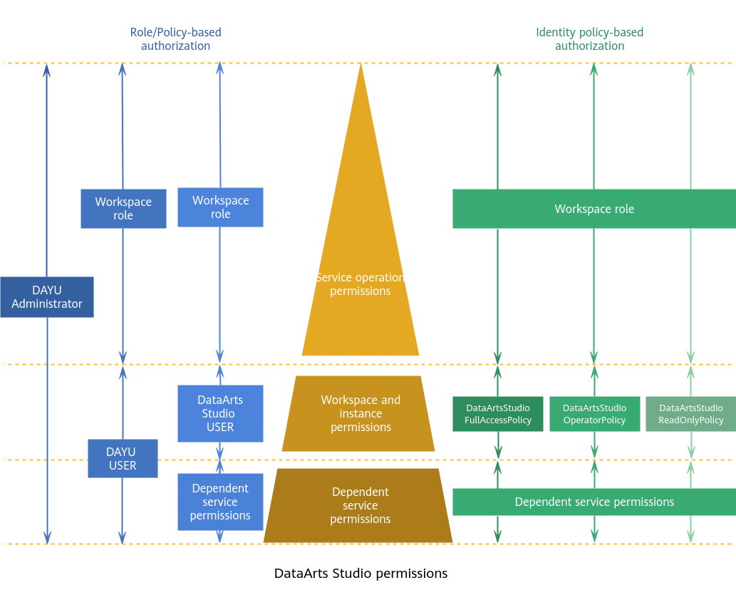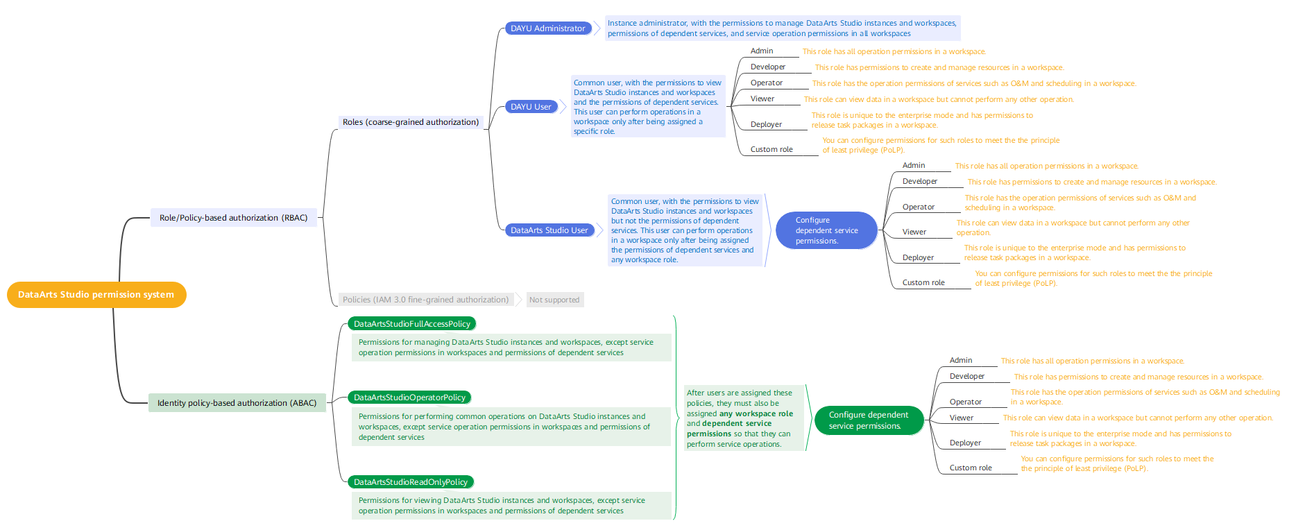 DataArts Studio supports system-defined roles (DAYU Administrator, DAYU User, and DataArts Studio User) but does not support system-defined policies and custom policies. |