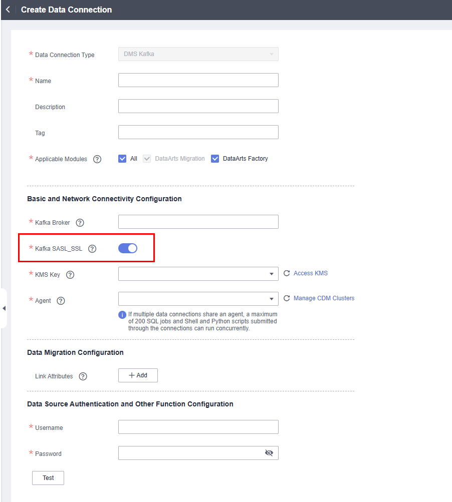 - Enable Kafka SASL_SSL when creating a DMS for Kafka connection.