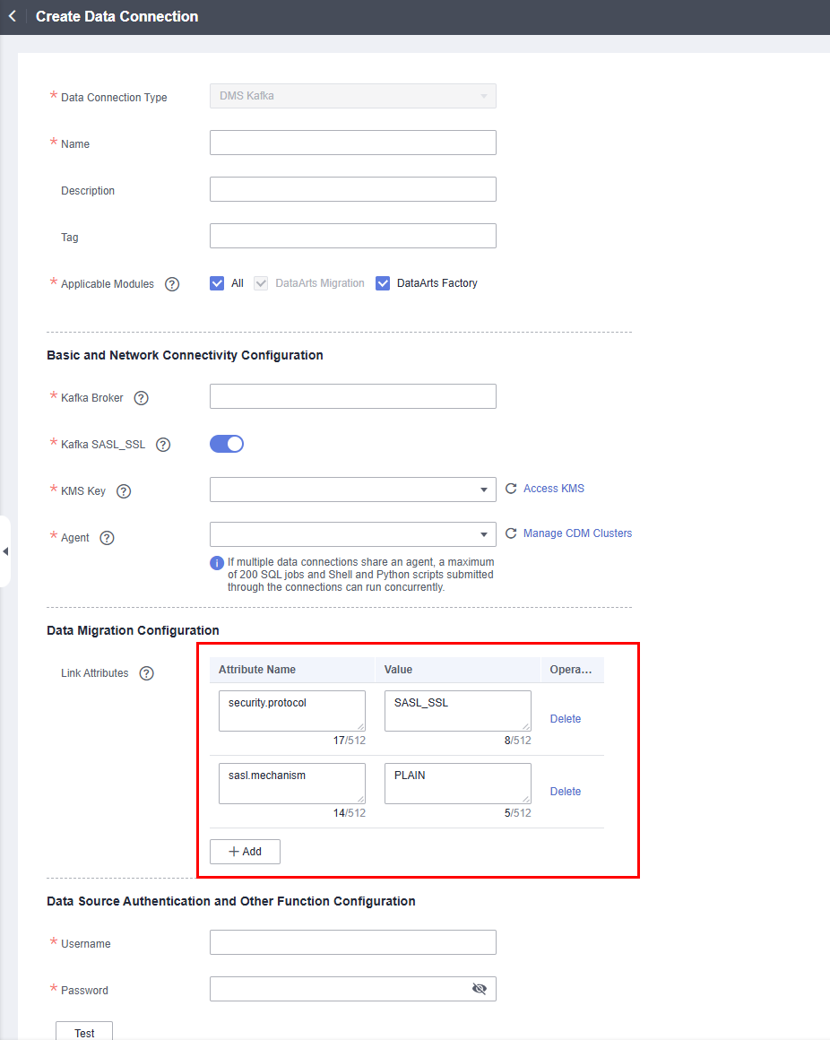 - Add two link properties based on the authentication configuration of DMS for Kafka.