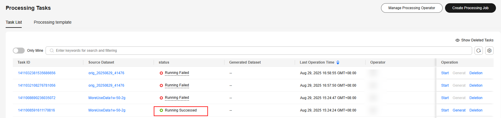 - After a processing, synthesis, or combination task is created for a dataset, the successfully executed task can be Running Succeeded or Dataset Generate Succeeded.