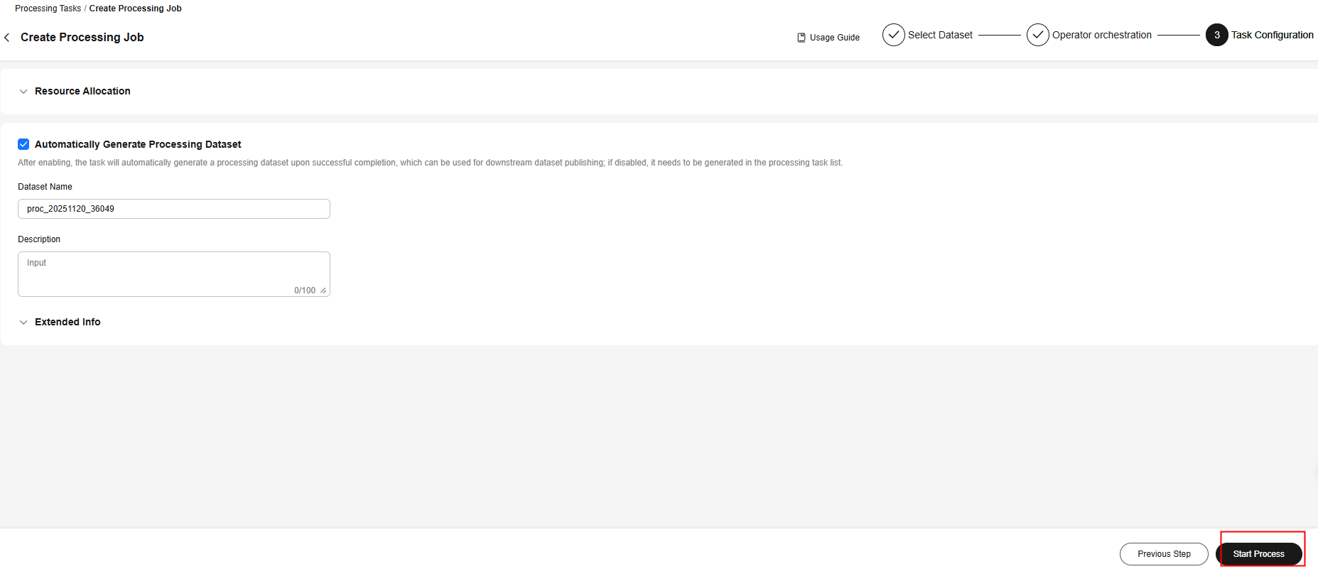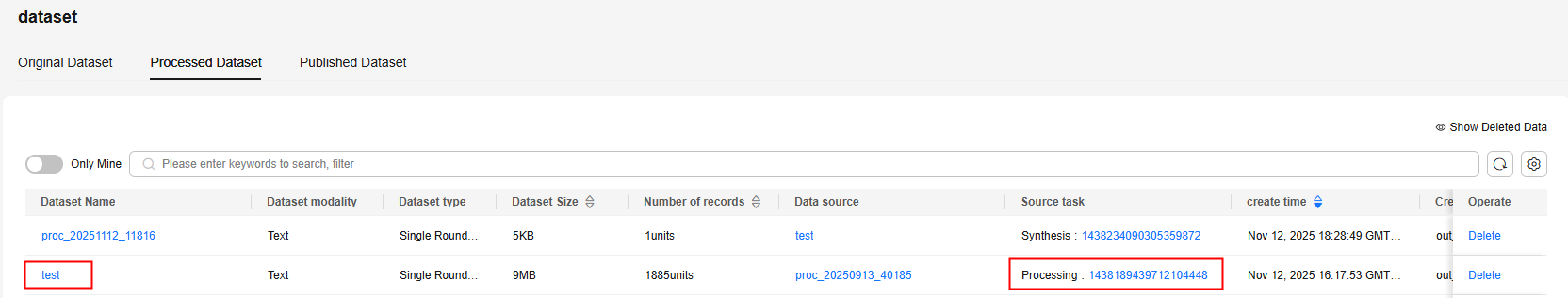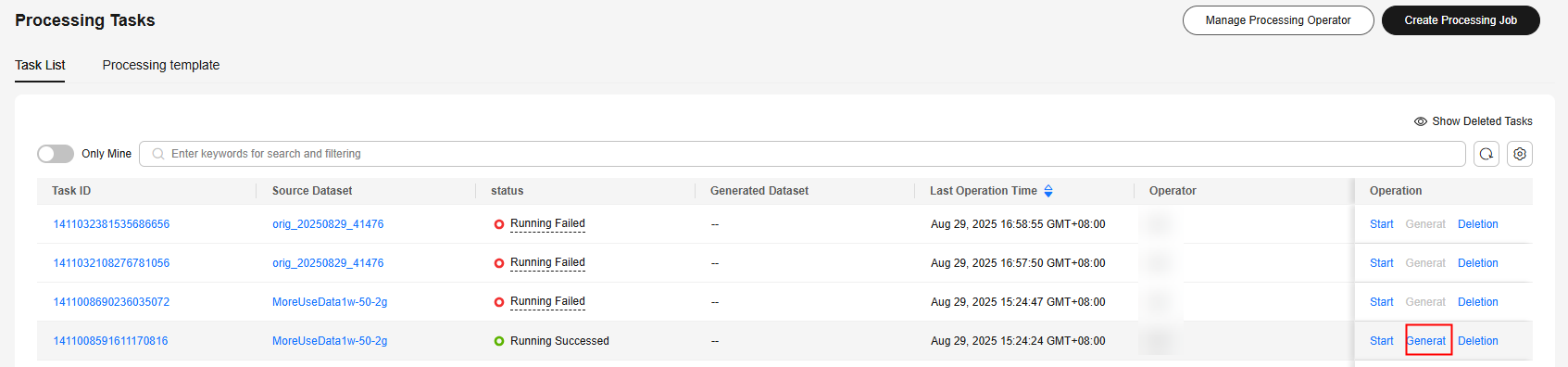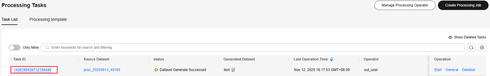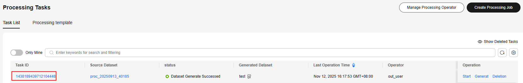 - Choose Data Processing > Processing Tasks or Data Management > Datasets > Processed Datasets to view the generated datasets.