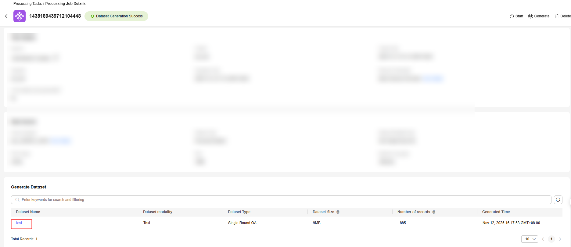 Click Generate in the Operation column. A dataset will be generated after the Status turns to Dataset Generate Succeeded. Then, you can locate the processed dataset by referring to 2.