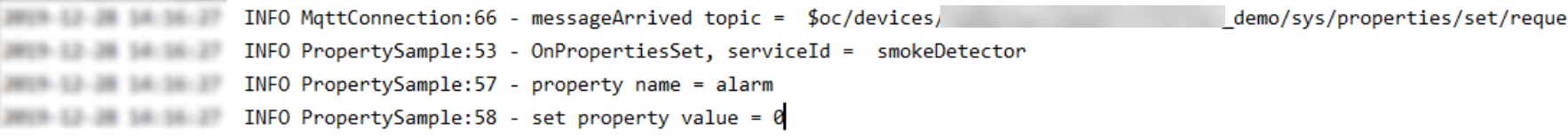 - Check the device logs, which indicates that the device receives the property setting and the value of alarm is changed to 0.