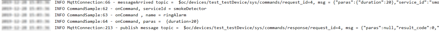- Run the CommandSample class and deliver a command on the platform. In the command, set serviceId to smokeDetector, name to ringAlarm, and paras to duration=20.