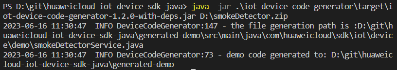 - Access the SDK root directory and run the java -jar .\iot-device-code-generator\target\iot-device-code-generator-1.2.0-with-deps.jar D:\smokeDetector.zip command.