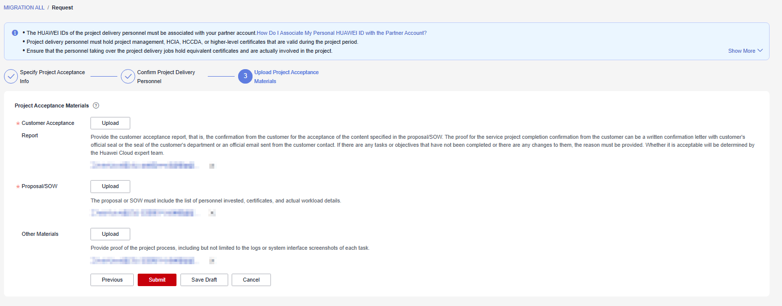- Customer acceptance report: It is the confirmation from the customer for the acceptance of the content specified in the proposal/SOW. The proof for the service project completion confirmation from the customer can be a written confirmation letter with customer's official seal or the seal of the customer's department or an official email sent from the customer contact. If there are any tasks or objectives that have not been completed or there are any changes to them, the reason must be provided. Whether it is acceptable will be determined by the Huawei Cloud expert team.