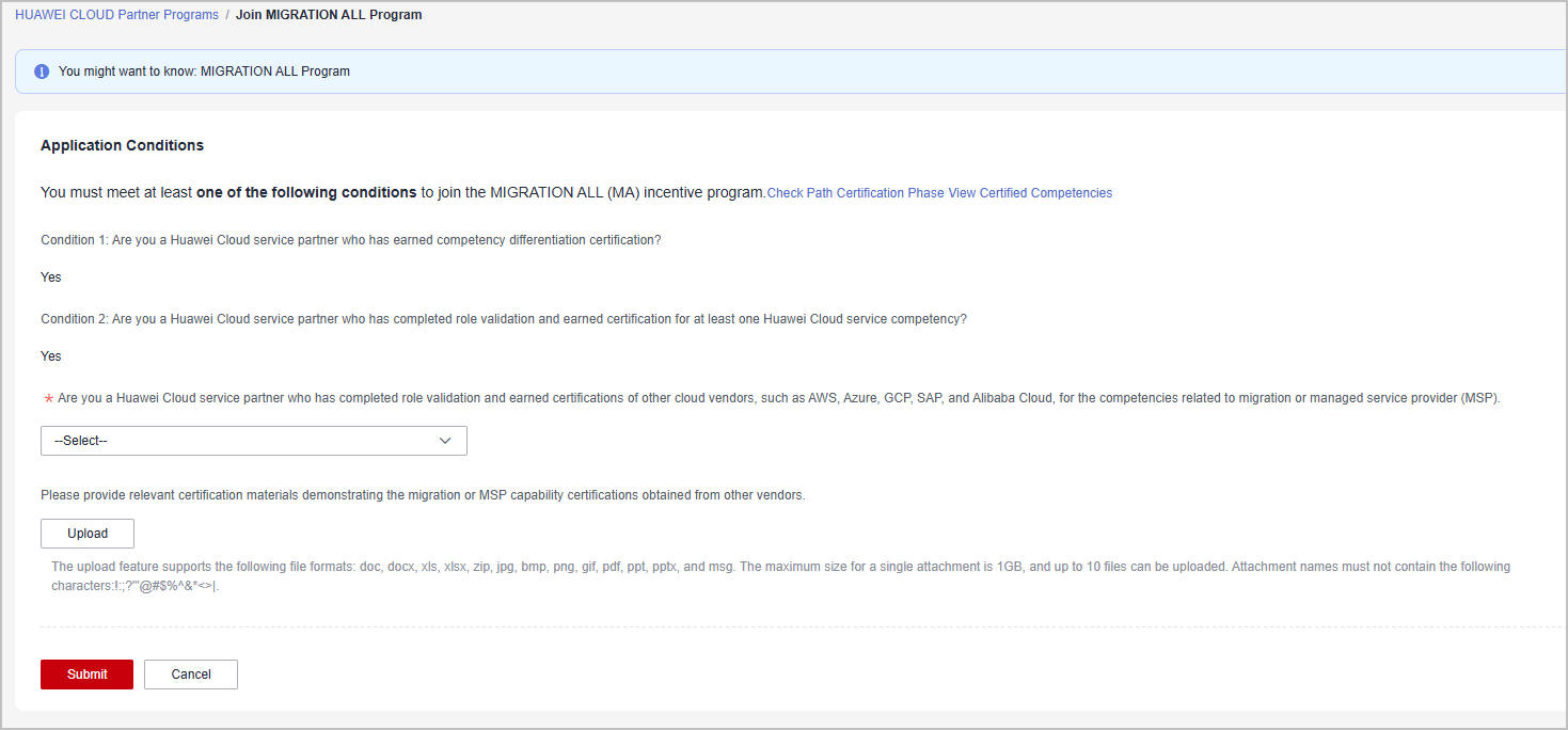 - Condition 3: You are a Huawei Cloud service partner who has completed role validation and earned certifications of other cloud vendors, such as AWS, Azure, GCP, SAP, and Alibaba Cloud, for the competencies related to migration or managed service provider (MSP).