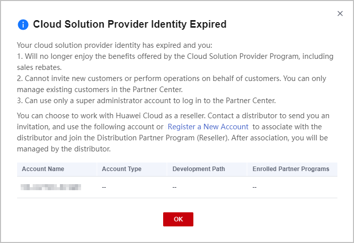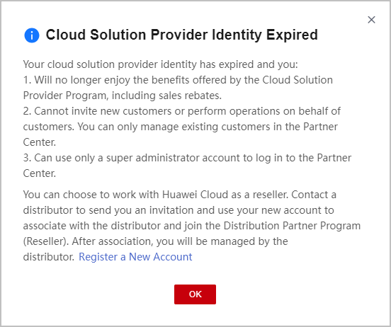 After your identity as a cloud solution provider expires, you can switch to another account or register a new account and apply to join Distribution Partner Program and become a Huawei Cloud reseller. Contact a distributor to send you an invitation and use your new account to associate with the distributor.