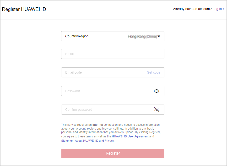 - On the Register HUAWEI ID page, enter required information and click Register.