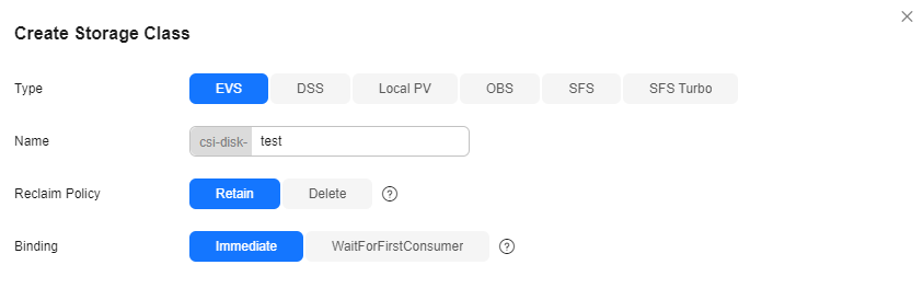 - WaitForFirstConsumer: When a PVC is created, it is not immediately bound to a PV. Instead, the storage resources and PV are created and bound to the PVC only after the pod that requires the PVC is scheduled. OBS, SFS, and SFS Turbo do not support WaitForFirstConsumer.
