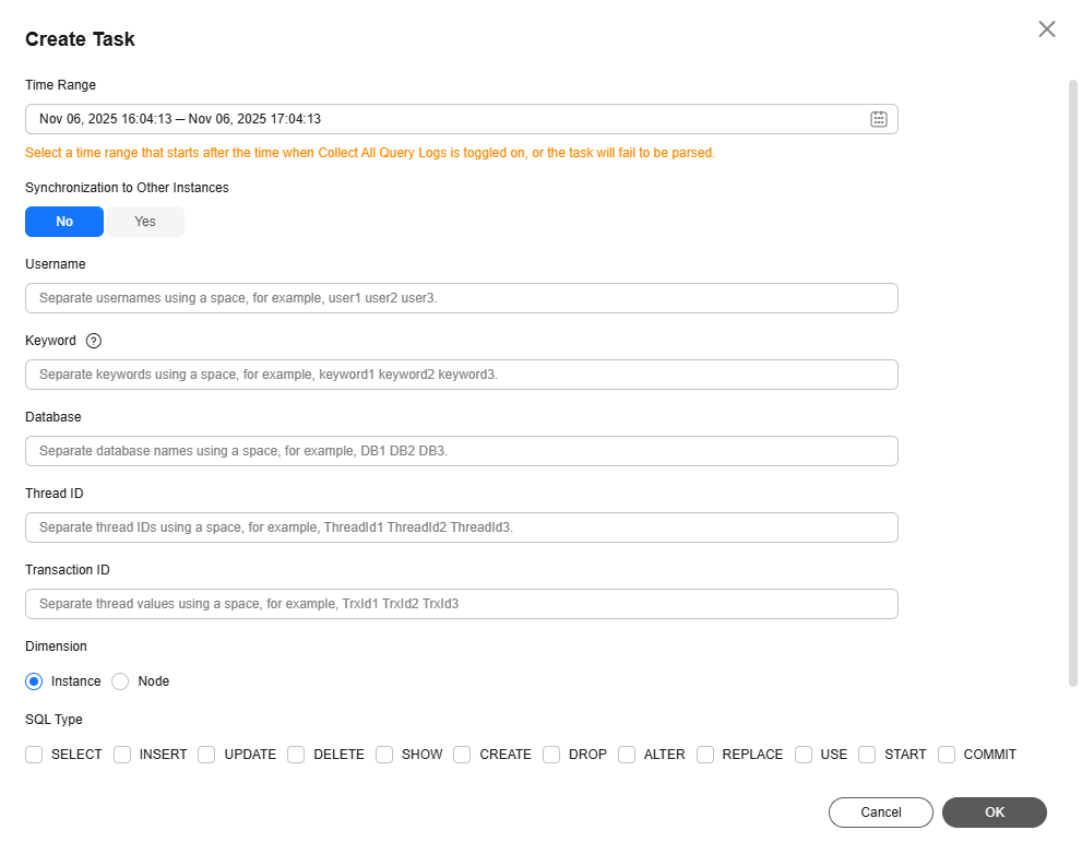 8. Click Create Task. In the displayed dialog box, specify Time Range, Dimension, and other configuration items and click OK.