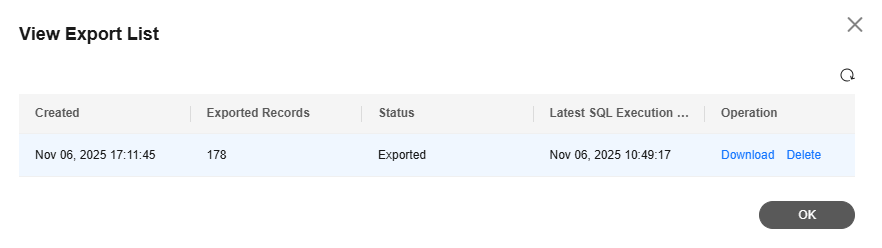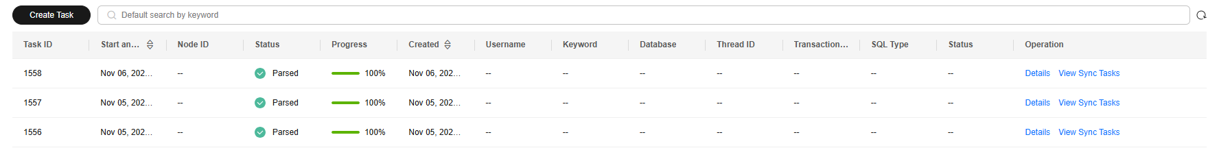 • Locate the target task and click Details in the Operation column to view and export details about the SQL Insights task.