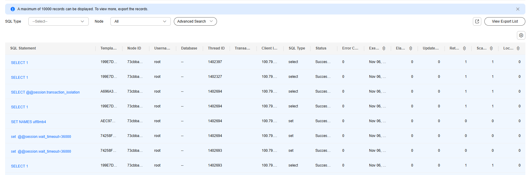 1. Set SQL Type, Node, and Advanced Search. Click to export the task details.