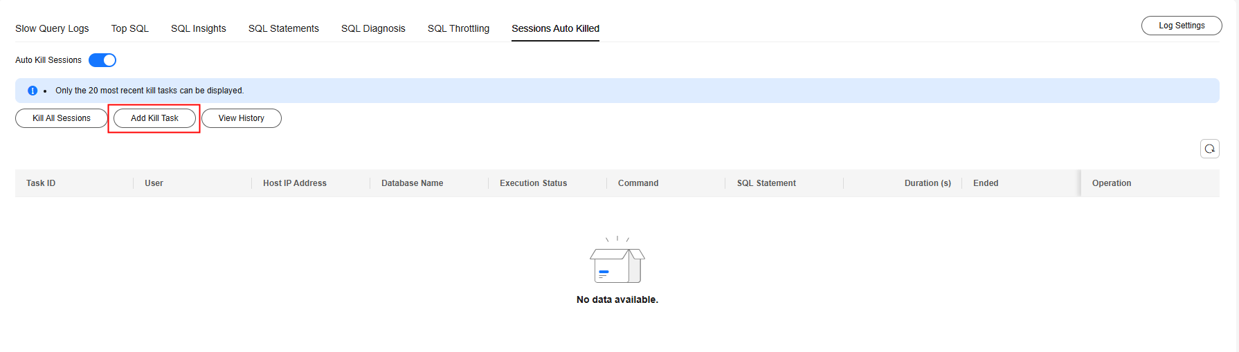 on the right of Auto Kill Sessions. In the displayed dialog box, click OK. - Click Add Kill Task.