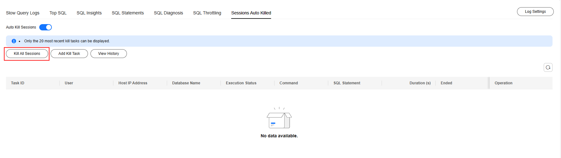 on the right of Auto Kill Sessions. In the displayed dialog box, click OK. - Click Kill All Sessions.
