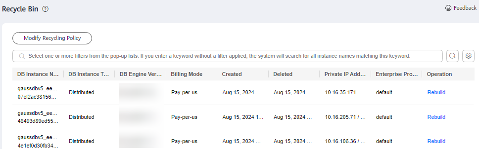 When you delete an instance, the system automatically creates a full backup and stores it in the recycle bin. Within the retention period, you can restore (also known as rebuild in this context) this instance by creating a new instance using the backup file. However, note that the restored instance will have a different private IP address from the original one.
