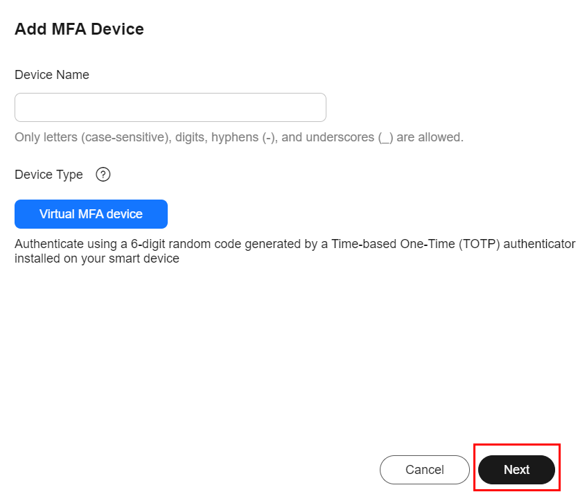An MFA device generates 6-digit verification codes in compliance with the Time-based One-time Password Algorithm (TOTP). MFA devices can be hardware- or software-based. Currently, only software-based virtual MFA devices are supported. They are application programs running on smart devices such as mobile phones.