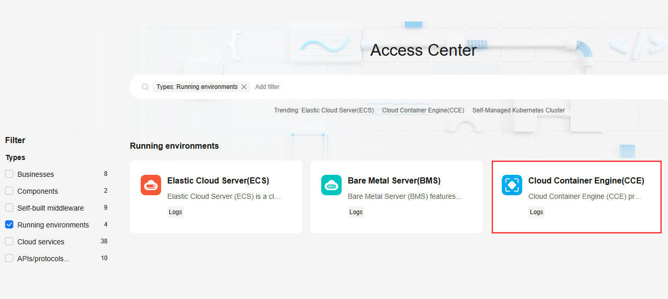 2. In the navigation pane, choose Log Ingestion > Ingestion Center. On the displayed page, select Running environments or Cloud services under Types. Hover the cursor over the Cloud Container Engine(CCE) card and click Ingest Log (LTS) to access the configuration page.