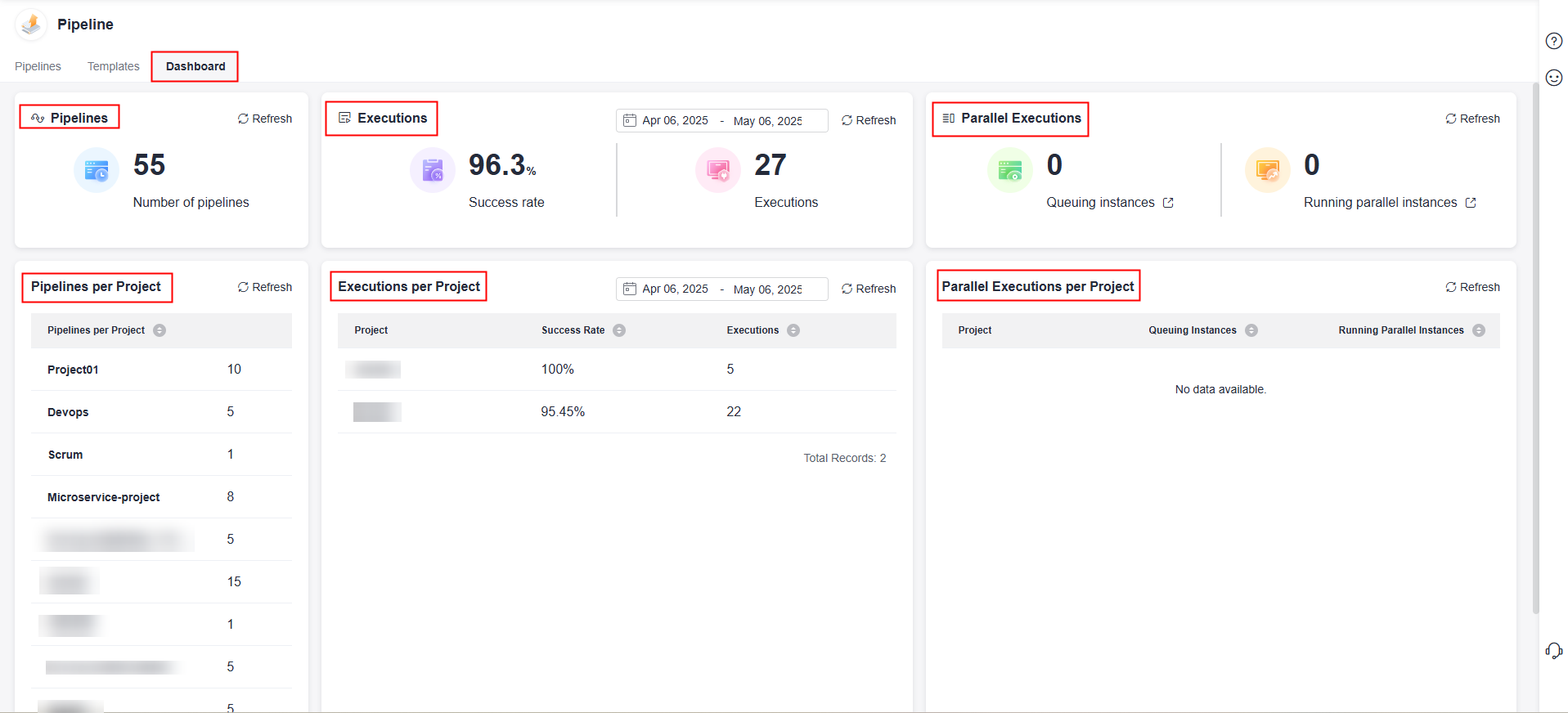 Execution success rate and execution times in each project. You can check executions during a specified period. You can also click a project name to access pipelines in this project.
