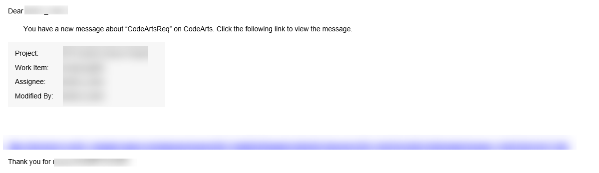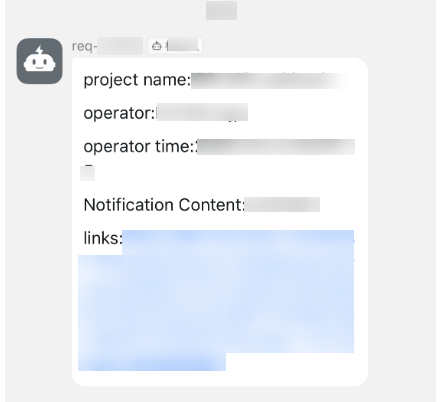 {"msgtype": "text","text": {"content": "CodeArts Req: Project ID: ${project.id} Work item name: ${issue.title} Operator: ${operator.username} Operator ID: ${operator.id} Review: ${review.title} Review URL: ${review.url} Event name: ${operation} Work item URL: ${issue.url}"}} - Feishu parameters: