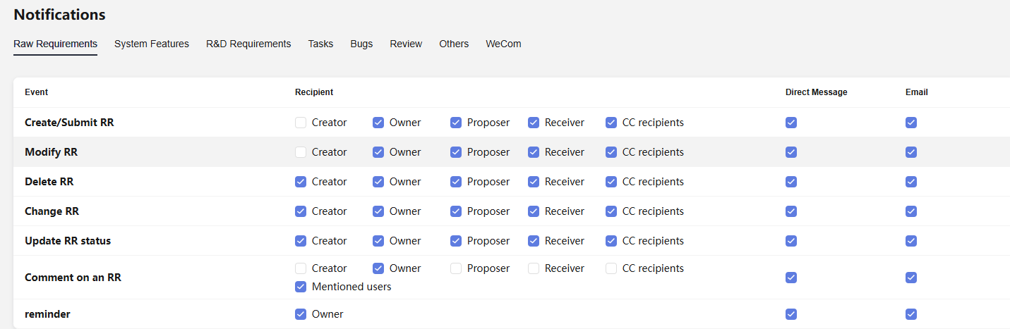 On the notification settings page, select the desired recipients and event types. Once set up, the chosen recipients will be alerted when specific events (for example, RR modification) take place.