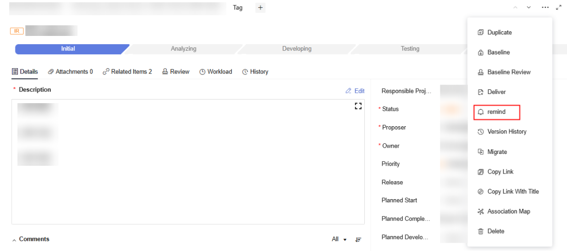 on the right of the work item details page and select remind. The current owner of the work item will receive the reminder notification. An example of reminding an IR is as follows.