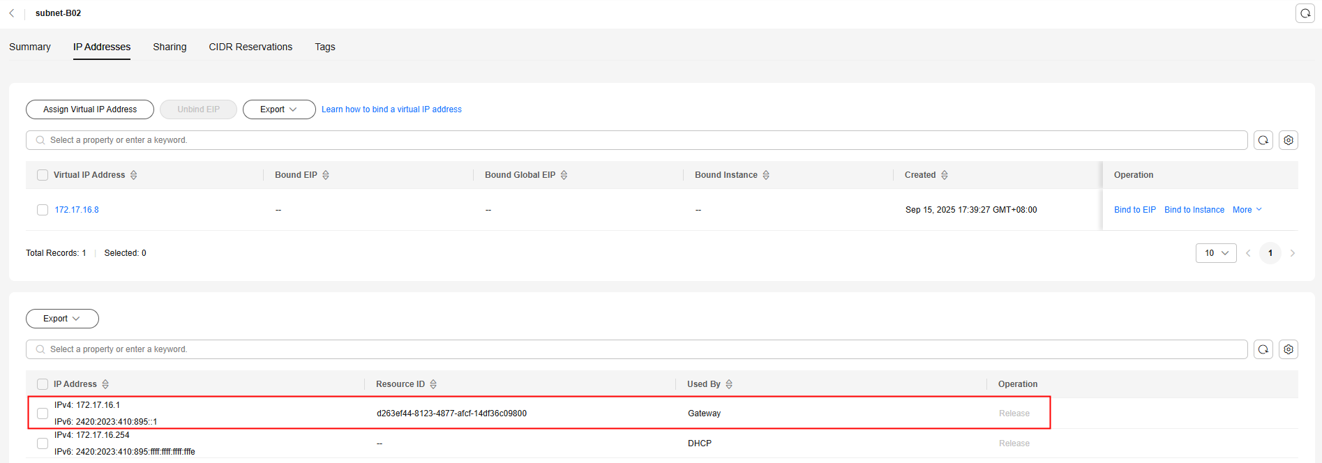 - Click the IP Addresses tab and view the gateway address of the subnet.