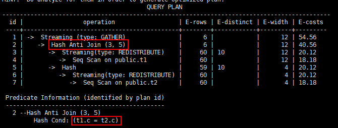 EXPLAIN VERBOSE SELECT * FROM t1 WHERE t1.c NOT IN (SELECT t2.c FROM t2); |